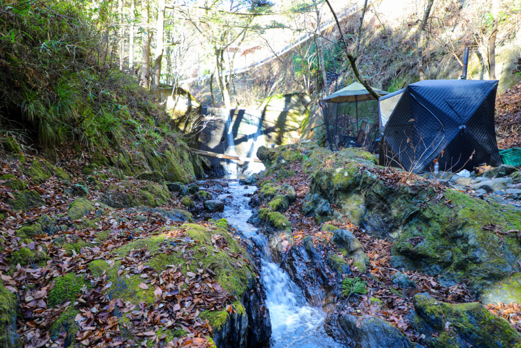 サウナで芯まで身体を温めた後は、いよいよ水風呂の時間です。MOSAICのロッジのすぐ脇には、秋川渓谷のさらに奥座敷、北秋川の支流である「総角沢(そうがくざわ)」が流れています。