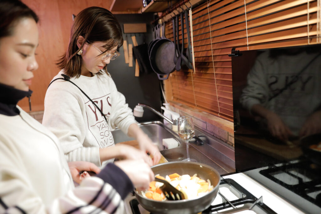 対して、MOSAIC Tokyo hinoharaが提供するのは、「食のプロセスそのものを愉しむ」という時間です。 ロッジ内には、キッチンと基本的な調理器具が完備されています。道の駅などで買い出した地元の野菜を、広々としたカウンターでゆっくりと刻む。その横では、大切な人がワインを注ぎながら語らっている。そんな「暮らすような」調理の時間が、ここには流れています。