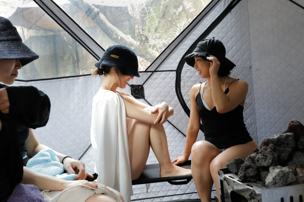 MOSAICの大きな魅力の一つが、オプションで追加できるテントサウナです。ここでも「ロッジらしさ」が際立ちます。あらかじめ設定されたホテルのサウナとは異なり、自分たちで薪をくべ、火を育て、温度を調整していく。このプロセス自体が、日常で忘れかけていた「生命の感覚」を呼び覚まします。